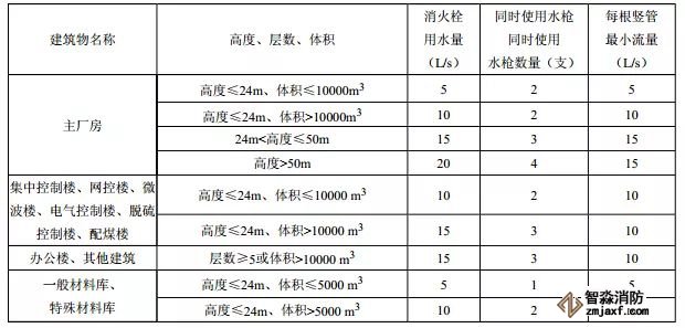火力發(fā)電廠為工業(yè)建筑,為了便于操作,根據(jù)各建筑的內(nèi)部情況和火災(zāi)危險(xiǎn)性,明確了設(shè)置室內(nèi)消火栓的建筑物和場所。見表4。在電氣控制樓等帶電設(shè)備區(qū),應(yīng)配置噴霧水槍,增強(qiáng)消防人員的安全性。