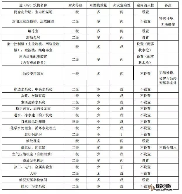 脫硫工藝樓,增壓風(fēng)機(jī)室,吸收塔,吸風(fēng)機(jī)室,屋內(nèi)高壓配電裝置(無油),除塵構(gòu)筑物,運(yùn)煤棧橋,運(yùn)煤隧道,油浸變壓器檢修間,油浸變壓器室,供、卸油泵房,油處理室,岸邊水泵房、中央水泵房,灰漿、灰渣泵房,生活消防水泵房,穩(wěn)定劑室、加藥設(shè)備室,進(jìn)水、凈水構(gòu)筑物,冷卻塔,化學(xué)水處理室,循環(huán)水處理室,啟動(dòng)鍋爐房,供氫站,推煤機(jī)庫,消防車庫,貯氫罐,空氣壓縮機(jī)室(有潤滑油),熱工、電氣、金屬實(shí)驗(yàn)室,天橋,排水、污水泵房,各分場維護(hù)間,污水處理構(gòu)筑物,電纜隧道,材料庫棚,機(jī)車庫,警衛(wèi)傳達(dá)室。