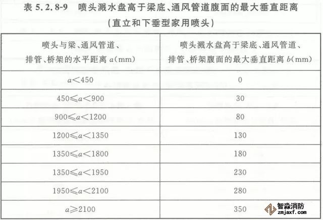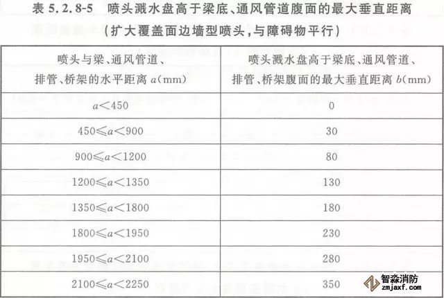 5.2.8 當(dāng)噴頭濺水盤高于附近梁底或高于寬度小于1.2m的通風(fēng)管道、排管、橋架腹面時,噴頭濺水盤高于梁底、通風(fēng)管道、排管、橋架腹面的最大垂直距離應(yīng)符合表5.2.8-1~表5.2.8-9的規(guī)定(見圖5.2.8)。