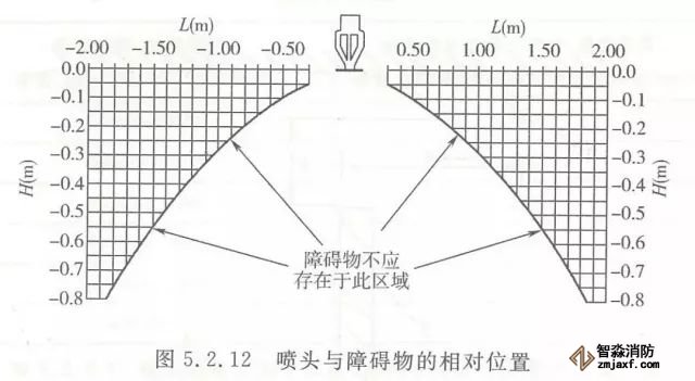 5.2.12 頂板處的障礙物與任何噴頭的相對位置,應(yīng)使噴頭到障礙物底部的垂直距離(H)以及到障礙物邊緣的水平距離(L)滿足圖5.2.12所示的要求。當(dāng)無法滿足要求時,應(yīng)滿足下列要求之一。