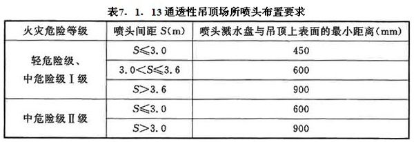 裝設(shè)網(wǎng)格、柵板類通透性吊頂?shù)膱鏊?,?dāng)通透面積占吊頂總面積的比例大于70%時,噴頭應(yīng)設(shè)置在吊頂上方,并應(yīng)符合下列規(guī)定:1 通透性吊頂開口部位的凈寬度不應(yīng)小于10mm,且開口部位的厚度不應(yīng)大于開口的最小寬度;2 噴頭間距及濺水盤與吊頂上表面的距離應(yīng)符合表7.1.13的規(guī)定。