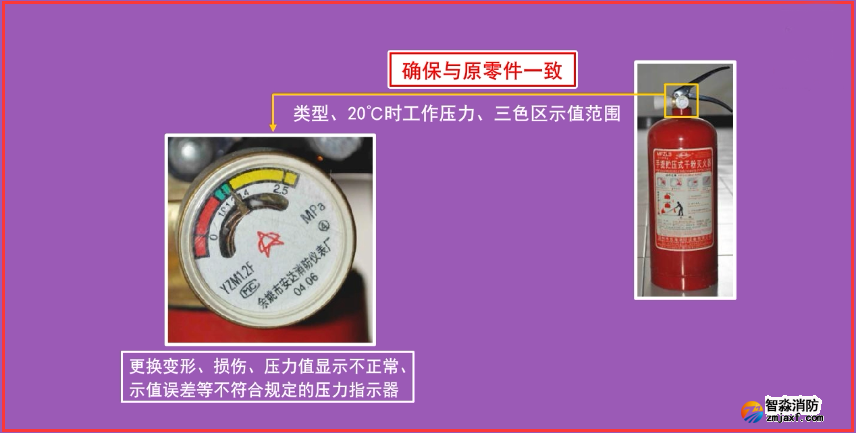 (5)更換具有嚴(yán)重?fù)p傷、變形、銹蝕等影響使用的缺陷的滅火器壓把、提把等金屬件;更換存在肉眼可見缺陷的儲(chǔ)氣瓶式滅火器的頂針。