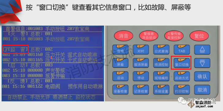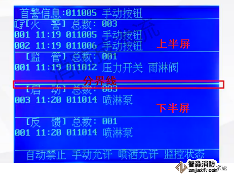 顯示屏分上、下半屏,上半屏為火警、監(jiān)管、故障、屏蔽等屬于報警信息,下半屏為啟動、反饋、動作等屬于聯(lián)動信息